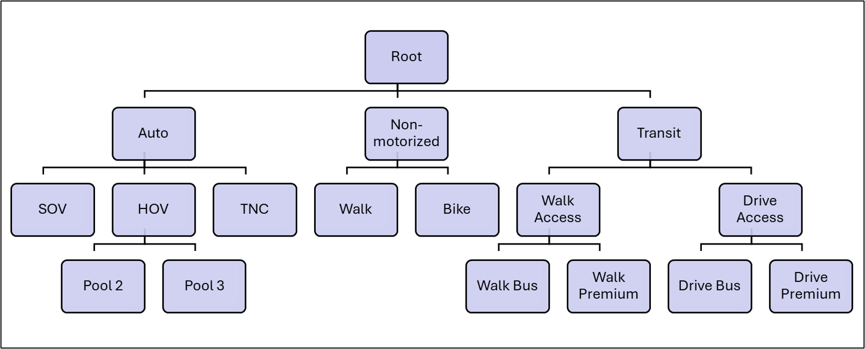 • The full set of transit modes (Walk Access to Bus, Walk Access to Rail, Drive Access to Bus, Drive Access to Rail) are alternatives only for the ‘Work’ and ‘Other’ tour purpose.