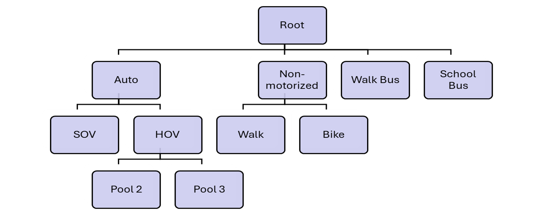 The mode choice model for the MRM was estimated based on the household survey records for 6 tour purposes: Work, Other, Shop, University, Sub-Tour and School tours. These models are estimated as nested logit models. Note that the previous Metrolina model did not have a mode choice model for school tours since it was based on a fixed shares model.