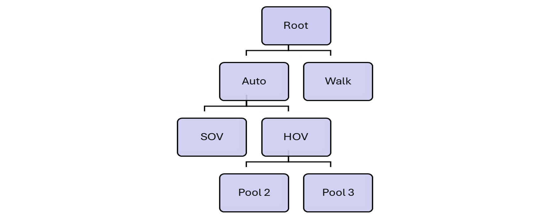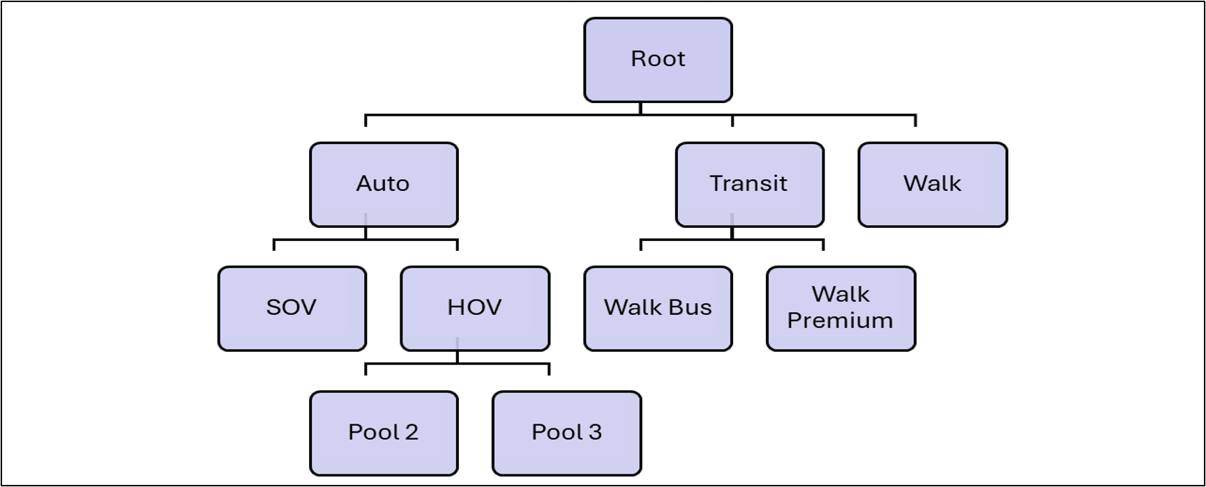 • The nesting structure can vary by purpose and do have multiple levels. Each alternative in a higher nest has a nest coefficient or theta that is typically estimated if possible. However, for the Metrolina model, estimation was possible only if these nesting coefficients were fixed. Values of 0.7 for the upper nests and 0.5 for the lower nest alternative are typical values and yielded successful estimation of other parameters.
