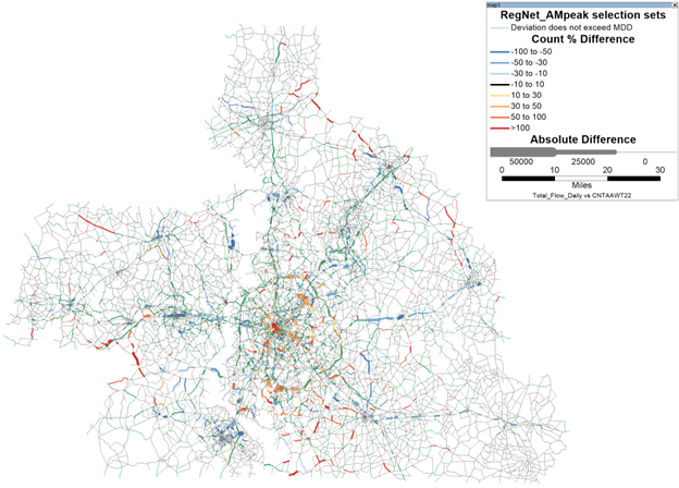 In addition to these summary-level validation checks, Caliper also checked for link level differences using the maps shown below.